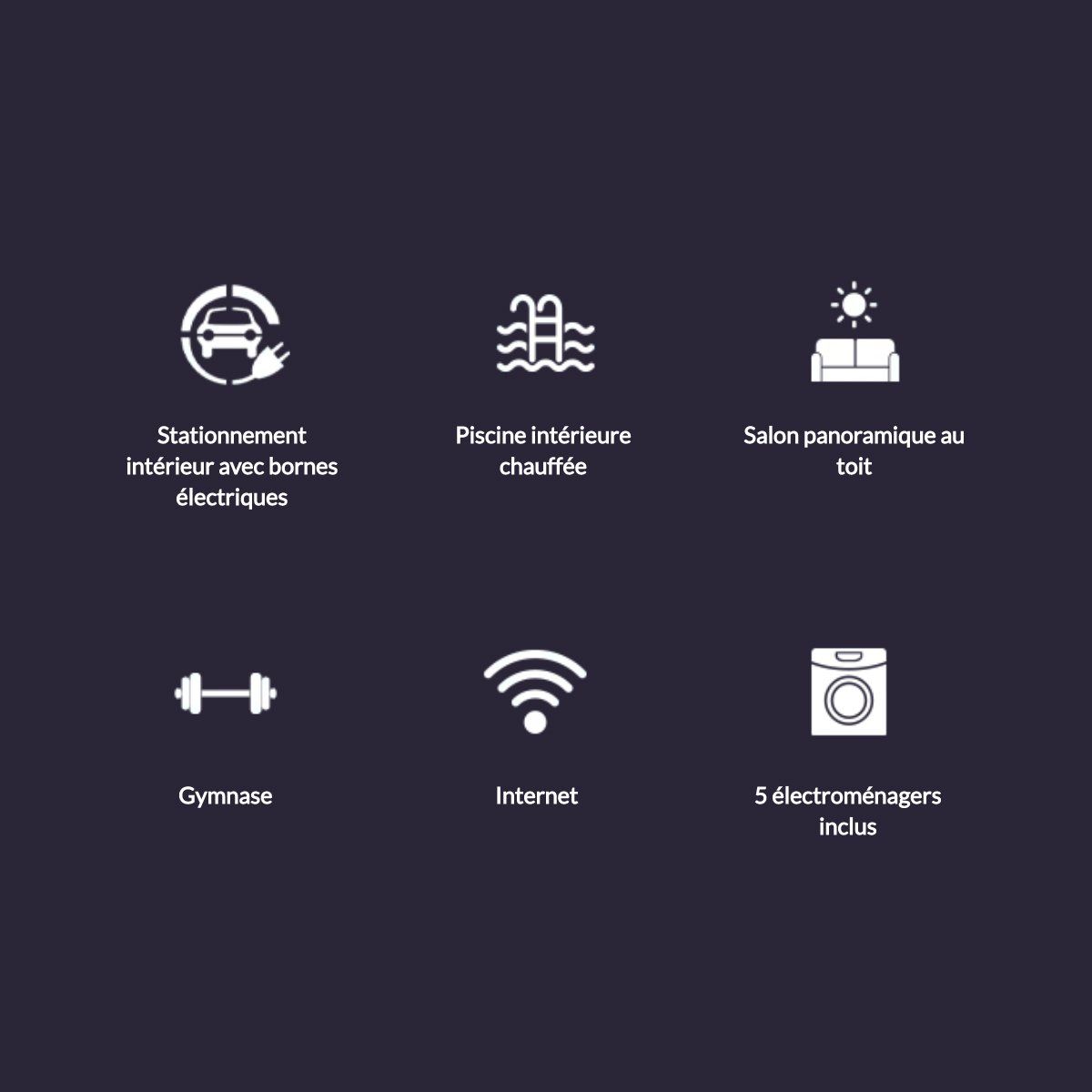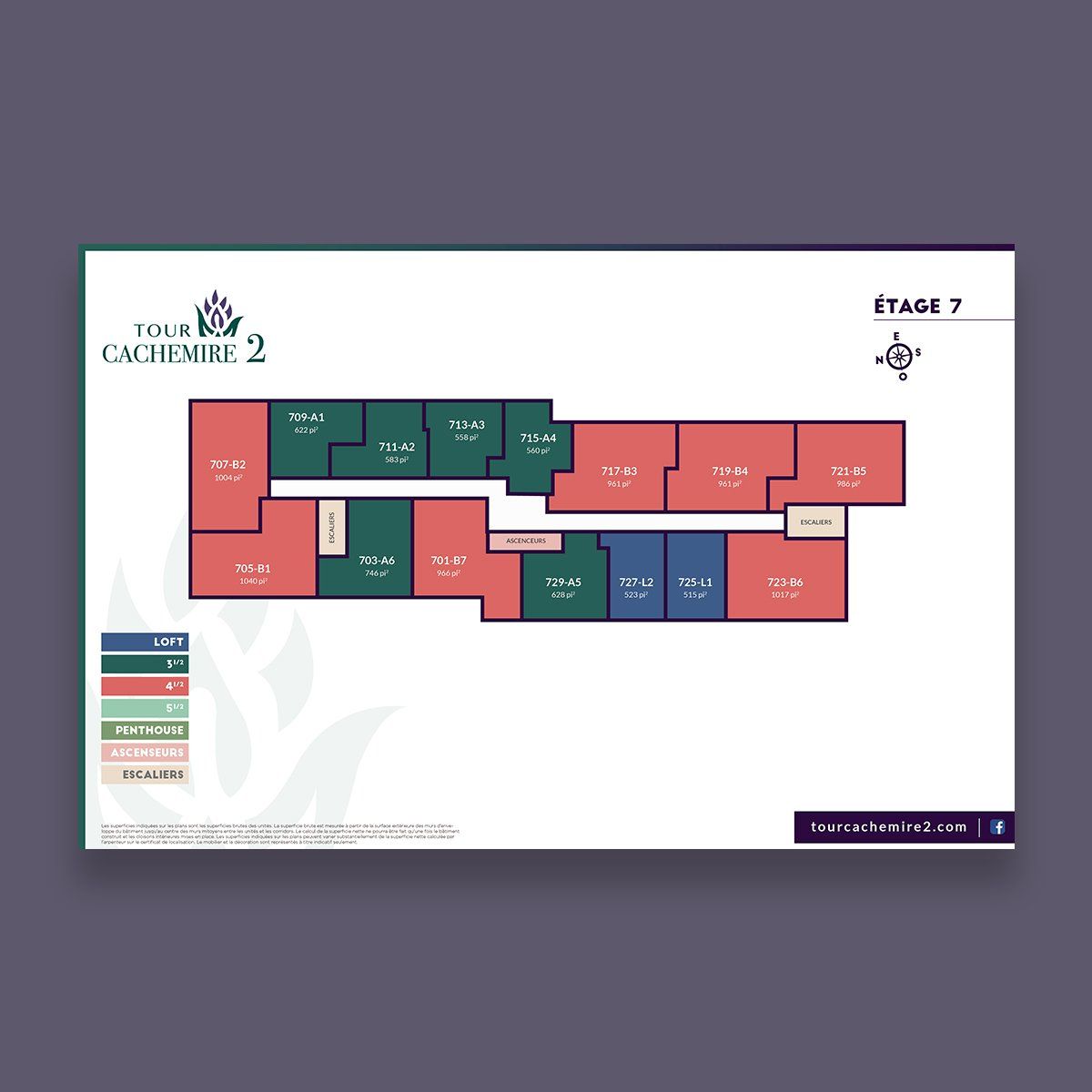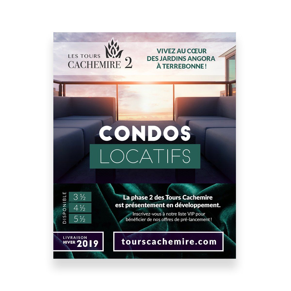 Notre équipe a travaillé de concert avec le département de design d’intérieur de TLA (TLADI) afin de créer une image de marque en parfaite harmonie avec l’esthétique du projet. Ensemble, nous avons convenu de deux couleurs accents qui sont riches et foncées soit le vert et le mauve. En complément au blanc et gris pâle présents dans tout le projet, ces couleurs amènent une touche de profondeur. En guise de texture, nous utilisons aussi dans le branding du marbre blanc, matériau que l’on retrouve en façade extérieure ainsi qu’à l’intérieur dans le salon panoramique. Un autre élément graphique intéressant dans les outils marketing est l’utilisation d’un motif géométrique composé de triangles. Ce motif est présent dans les espaces communs et utilisé en découpes laser pour créer des jeux de lumière dynamiques. Les outils marketing développés pour Tour Cachemire 2 sont donc en parfaite symbiose avec le concept de design d’intérieur. Le résultat est délicat et très raffiné. Au final, nous avons conçu pour ce projet un site Web, une affiche, des publicités imprimées, tous les plans de location ainsi qu’un modèle pour infolettres.