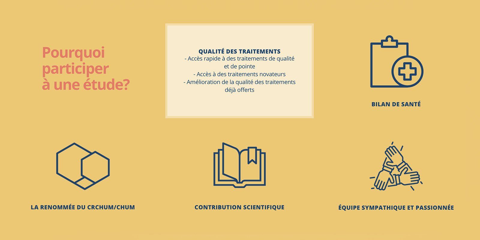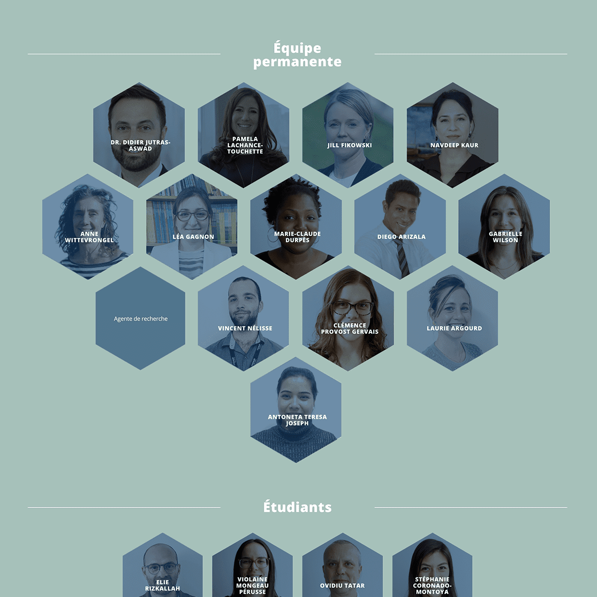 Le design reprend à plusieurs endroits la forme de l’hexagone que l’on retrouve dans le logo du CHUM. Un lien visuel est ainsi fait entre les deux entités. La palette de couleurs choisies a aussi pour objectif de créer un rappel avec les couleurs corporatives du CHUM. Afin d’obtenir un look plus humain et moins scientifique, nous avons jumelé au bleu foncé et au vert des couleurs plus chaudes et douces telles que du jaune, du rose pâle et du corail. Ce site Web bilingue est maintenu à jour par l’équipe du laboratoire qui peut entre autre mettre à jour les études et publier des nouvelles.