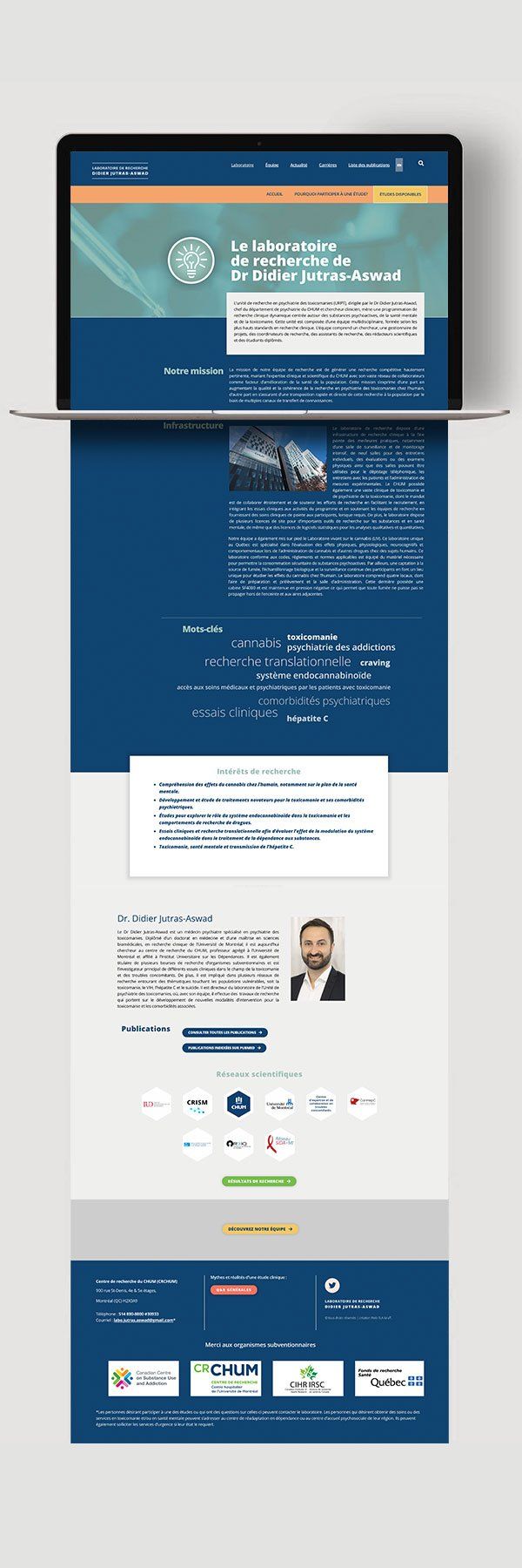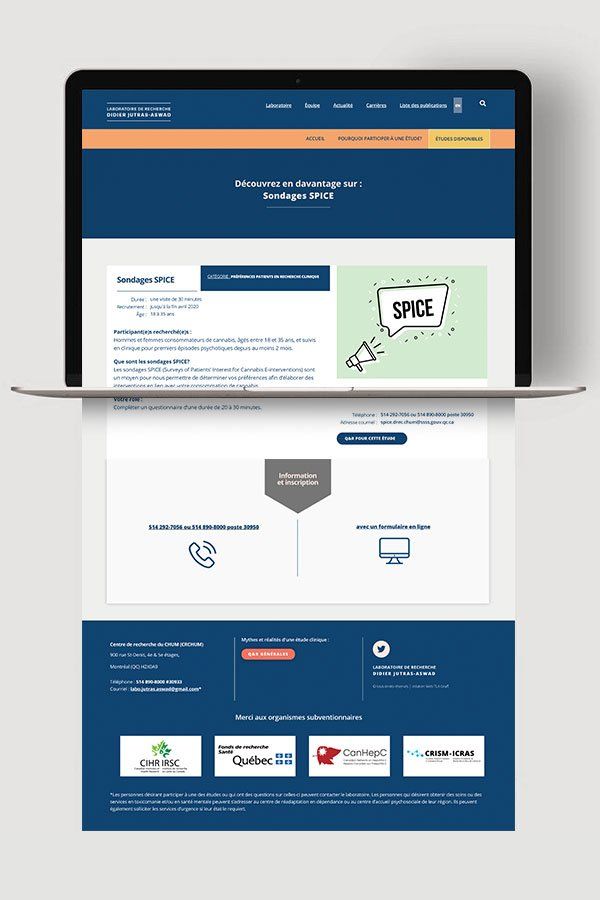 Le laboratoire de recherche Didier Jutras-Aswad est dirigé par le docteur du même nom et chef du département de psychiatrie du CHUM. Un nouveau site Web était nécessaire pour mettre de l’avant les recherches du laboratoire en matière de santé mentale et de toxicomanie ainsi que l’équipe de professionnels qui oeuvrent au sein de l’organisation. Le nouveau site Web s’inscrit donc dans une stratégie de communication qui vise à faire connaitre le laboratoire, mais aussi à mousser le recrutement de patients pour les différentes études cliniques en cours. Afin d’interpeler adéquatement les deux types de personas ciblés, nous avons opté pour une navigation à deux menus. Ainsi, le menu principal s’adresse aux patients potentiels en quête d’information sur des études cliniques, alors que le menu secondaire s’adresse davantage à des personnes du milieu scientifique ou encore des médias.